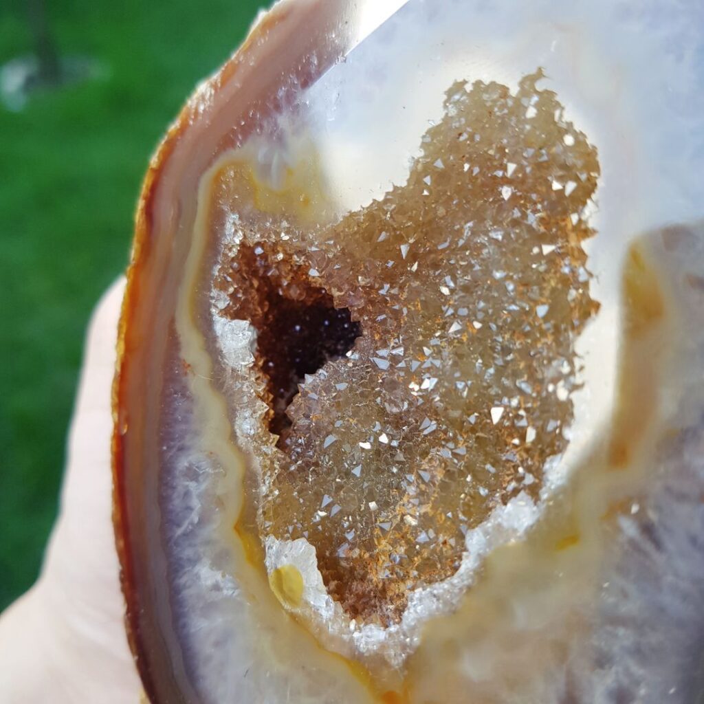 Muitas ágatas são ocas, uma vez que a deposição não prosseguiu pelo tempo suficiente para encher a cavidade.